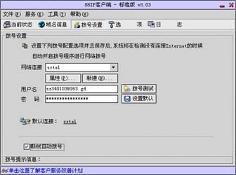 • 设置88IP客户端的自动网络连接功能 目前,88IP客户端能实现各种拨号网络的自动网络连接,包括ISDN、电话拨号、ADSL和其他PPPOE形式。点击“拨号设置”,在“网络连接”中选择自己建立的INTERNET拨号连接,或点击“新建”,建立新的拨号连接。